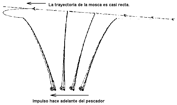 Cuando paramos la caña, la línea continúa el impulso inicial por encima de la punta de ésta formando un bucle convexo (llamado loop en inglés), que al desarrollarse deja inmóvil la porción de línea en contacto con la caña y acelera la parte que va unida a la mosca.