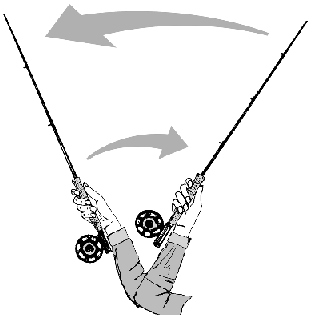 Cuando tiramos lejos o deseamos minimizar el impulso de la mano derecha necesitamos el doble tirón que ayuda a flexionar la caña, aumentando la potencia y velocidad de la línea.