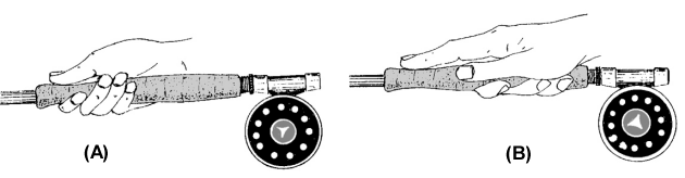 El primer paso para un lance óptimo, se consigue empuñando correctamente la caña. Hay varias maneras de aferrar el mango; Dos opciones interesantes son mostradas en los dibujos siguientes: