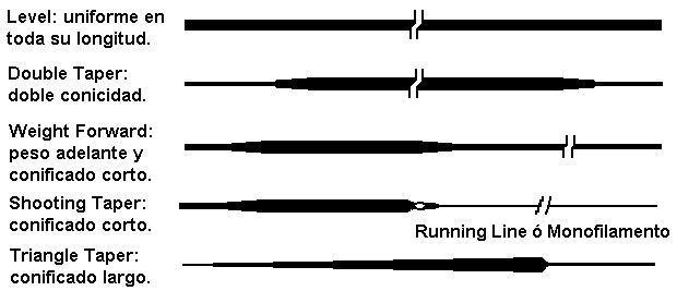 Observando el cuadro con los diferentes tipos de líneas, veremos que todas tienen el mismo peso en sus primeros 9 metros, pero distinto volumen y esto modifica su comportamiento en el lanzado; por ejemplo: un pescador que realiza muchos lanzamientos en una jornada, necesitará minimizar la energía inicial requerido en cada uno, siendo la línea uniforme "LEVEL" la primera, seguido del conificado largo "TT", luego el conificado corto "WF" y al final el de doble conicidad "DT", éste último necesita el doble de energía del uniforme por su volumen.