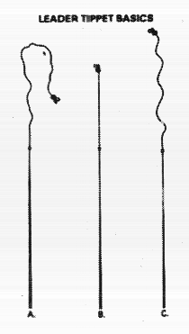 Si la mosca cae sobre el Tippet (figura A), es muy fino o muy largo y debemos continuar ajustando el largo o el diámetro hasta obtener, después del casteo un Tippet sinuosamente ondulado y con curvas en «ese»(figura C).