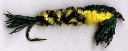 Lastrar el anzuelo en su 75% delantero. Como cola se atan 10 puntas de fibras de pavo real con un largo no mayor al de un gap (tamaño de la abertura del anzuelo). Como abdomen hasta el 60% del anzuelo chenille amarillo varigado o bien dos chenilles amarillo y negro retorcidos, o chenille amarillo ribeteado con tinsel plastico negro. Acá se fijan unas 20 fibras de espada tomadas del raquis con un largo final al doble de la distancia a la cabeza ya que luego las puntas de las fibra se convertirán en patas, el largo conveniente se obtiene presentando las fibras como cubre ala y volcándolas hacia abajo del ojo, y observando de no superar las puntas el tamaño de un gap. Luego se coloca el tórax de chenille amarillo hasta a la cabeza, se vuelcan las fibras como cubre ala y se fijan con 3 vueltas a la cabeza luego se reparten las mismas mitad a cada lado del ojo tomando las con las yemas del indice y pulgar y orientando las hacia abajo y hacia atrás, se vuelven a fijar en la cabeza y a pescar.