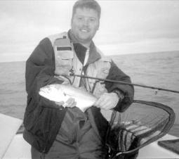 En la segunda salida que compartí con Gonzalo Traverso, a fines de mayo, las anchoas y palometas ya se estaban retirando y el tiempo no nos acompaño, pero así y todo hicimos una pesca excelente de pejerrey escardón. Mientras el mismo no se acardumó teníamos algunos piques, pero la pesca comenzó al "pararse" el agua, momento en el cual los peces se acardumaron debajo de la lancha atraídos por la ceba y podíamos ver 5 0 6 nadando detrás de nuestra mosca y peleándose por tomarla. Hicimos algunas observaciones muy interesantes, como por ejemplo que luego de sentir varios toques sin poder clavar, vimos como un pejerrey mordía la cola de mi blonde sin clavarse, en ese momento cambié por un camarón con una cola muy corta y empecé a pescar.