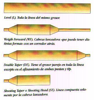 Es una de las primeras cosas que aprendemos en pesca con mosca. Es muy raro que alguien compre una línea 4 para una caña 9 o viceversa. El peso está dado por los primeros 9 metros de una línea sin considerar el "tip"(ver tabla de pesos). Es un aspecto que fue estandarizado por una Asociación de fabricantes de líneas de U.S.A. (A.F.T.M.A.), esto es adoptado por todas las fábricas de líneas del mundo. Hay líneas con pesos especiales indicados en grains, pero no deseo explayarme acerca de estas líneas pues son casos especiales y escapa al objetivo de esta nota.