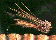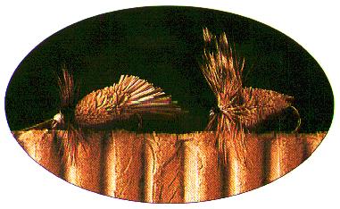 Cuerpo: pelo de ciervo atado y girado alrededor del anzuelo, luego recortado abajo y en el frente para lograr la forma.